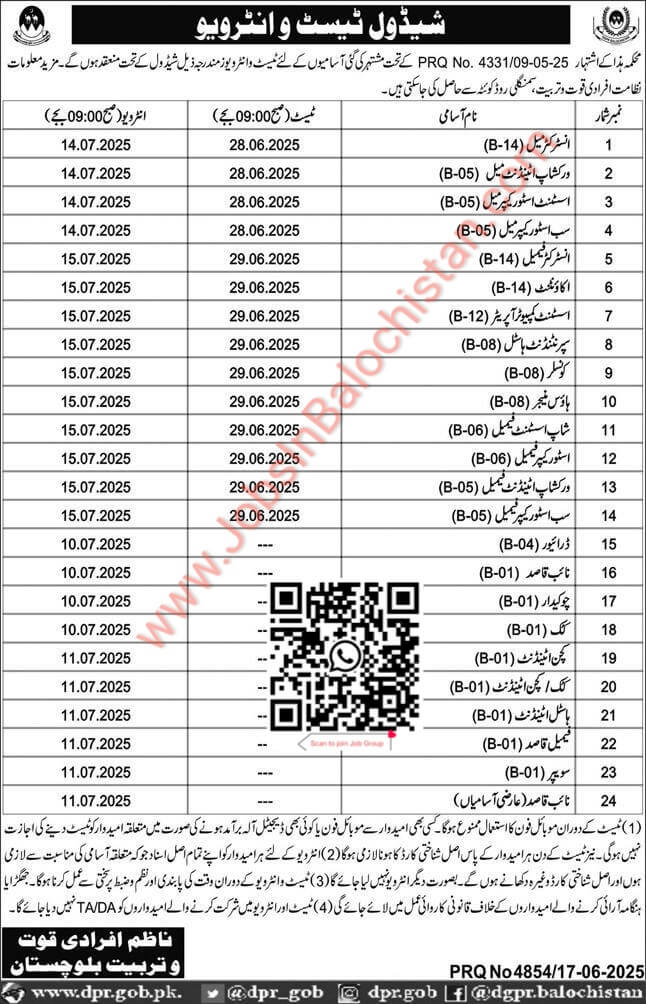 Candidates who have applied for Manpower Training Balochistan Department Balochistan Under Job Advertisement (PRQ 4331/09-05-2025) for following vacancies in Balochistan, is hereby informed that their Test, Jobs In Balochistan will be conducted according to the following schedule: