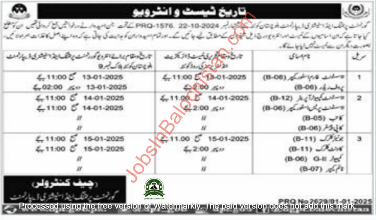 Candidates who have applied under advertisement no. PRQ 1576/22-10-2024 for following vacancies in Printing and Stationary Department Balochistan, is hereby informed that their Test & Interview call Jobs In Balochistan will be conducted according to the following schedule:
