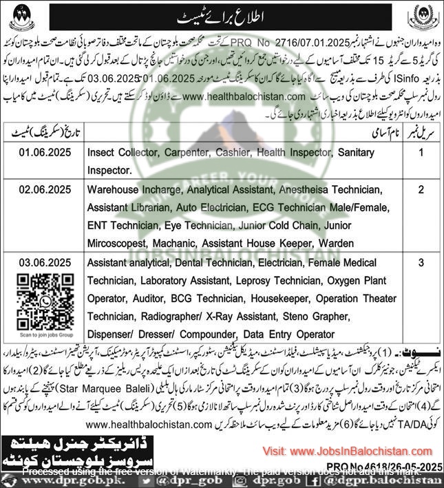 Candidates who have applied for Health Department Department Balochistan View Full Job Advertisement (PRQ 2716/07-01-2025) for following vacancies in Balochistan, is hereby informed that their Test, Jobs In Balochistan will be conducted according to the following schedule: To view job advertisement click here