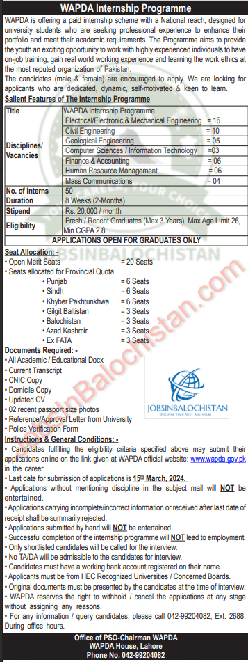 Apply for the WAPDA Internship Program 2024 in Balochistan – a paid opportunity for university students and recent graduates across Pakistan. Gain real-world experience in disciplines like Electrical Engineering, Civil Engineering, Computer Sciences, Finance, and more. Hurry, applications close on March 15, 2024!