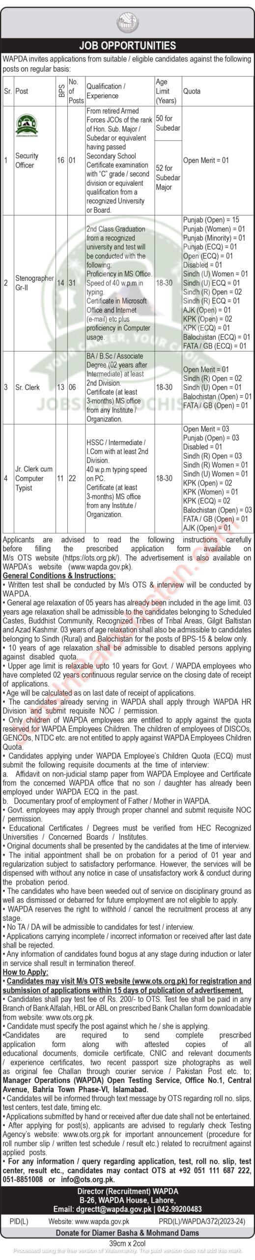 before filling the prescribed application form available on M/s OTS website (https://ots.org.pk/). The advertisement is also available on WAPDA’s website (www.wapda.gov.pk).