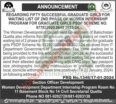 Welcome to the Women Development Department Government of Balochistan Quetta’s official announcement regarding the waiting list for the 2nd phase of the Women Internship Program for Graduate Girls under PSDP Scheme No. 977822020.0648 for the year 2023-24.