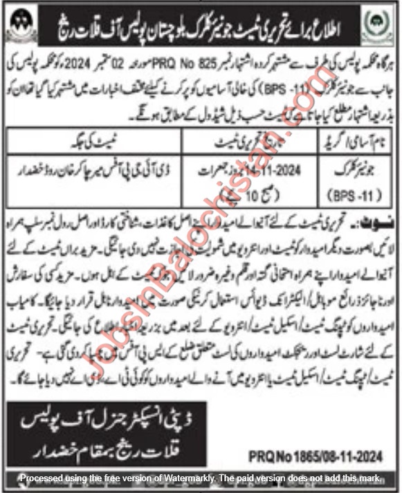 Written Test Balochistan Police Kalat Range Junior Clerk Jobs 2024