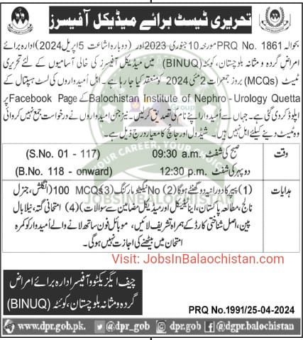 (Ref. 1861.PR No dated 10th January 2023 and republished 5th April 2024) Written Test (MCQs) for the vacancies of Medical Officers in Institute of Kidney and Bladder Diseases Balochistan, Quetta (BINUQ) will be held on Thursday 2nd May 2024. Is . List of Eligible Candidates Hospital Facebook Page Balochistan Institute of Nephro – Urology Quetta has been uploaded. From where candidates can confirm their name. Also the candidates who have not submitted the application are not eligible to take the test. The schedule and criteria of examination are as follows.