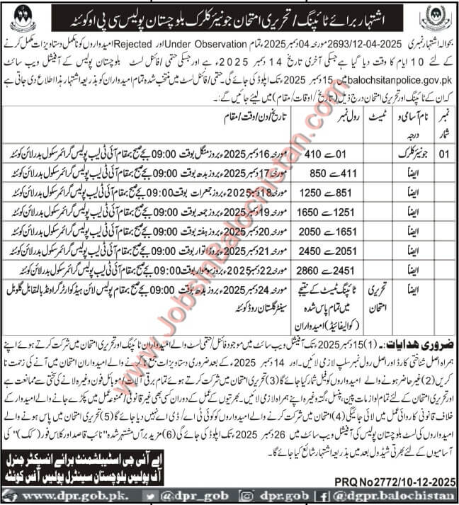 Written test schedule Junior Clerk of Balochistan Police, jobs In Balochistan 2025. The vacancies have been announced in Balochistan through the Intekhaab Quetta Newspaper.