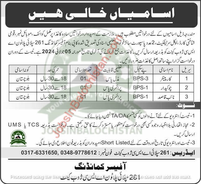 Applications are required for the following posts. Job candidates send applications on plain paper with complete details, mobile number, national identity card, local certificate, 2 passport size photographs and attested copies of educational certificates to the Officer Commanding 261 Supply Platoon AS at Zhob Cantt. The last date for submission of quotations is 05 July 2024. During the test Applicants must bring original food with them.